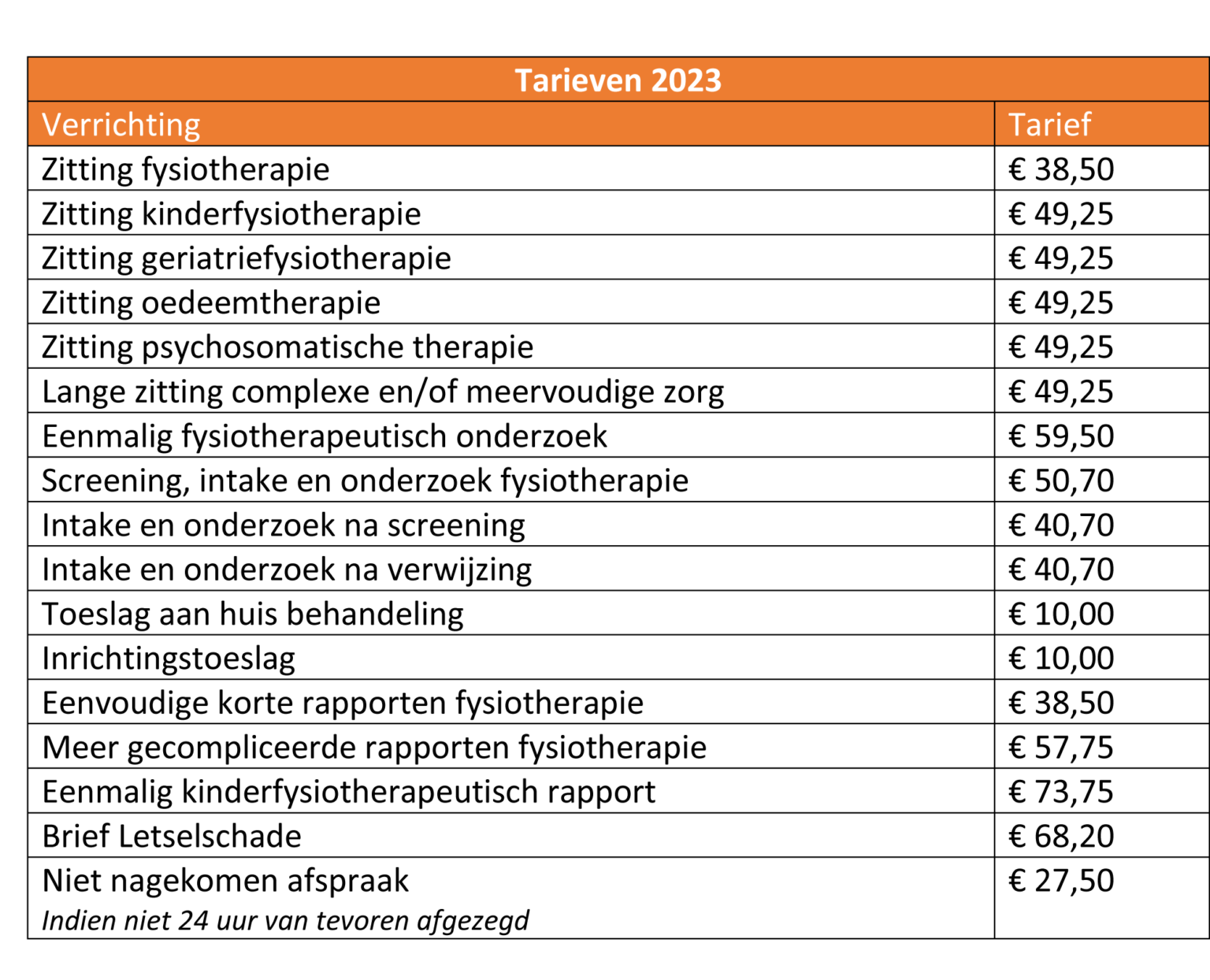 Fysiotherapie wordt vergoed vanuit de aanvullende verzekering. Bij elke verzekeraar en elk pakket is dit anders. Het is dan ook goed om na te gaan of u verzekerd bent voor fysiotherapie en hoeveel behandelingen u vergoed krijgt. Wij hebben in 2023 met alle zorgverzekeraars een contract behalve met Zorg en Zekerheid. Bent u bij Zorg en Zekerheid verzekerd dan ontvangt u van ons een nota die u zelf kunt indienen. U krijgt afhankelijk van uw polis dan 70%, 80% of 100% vergoed.